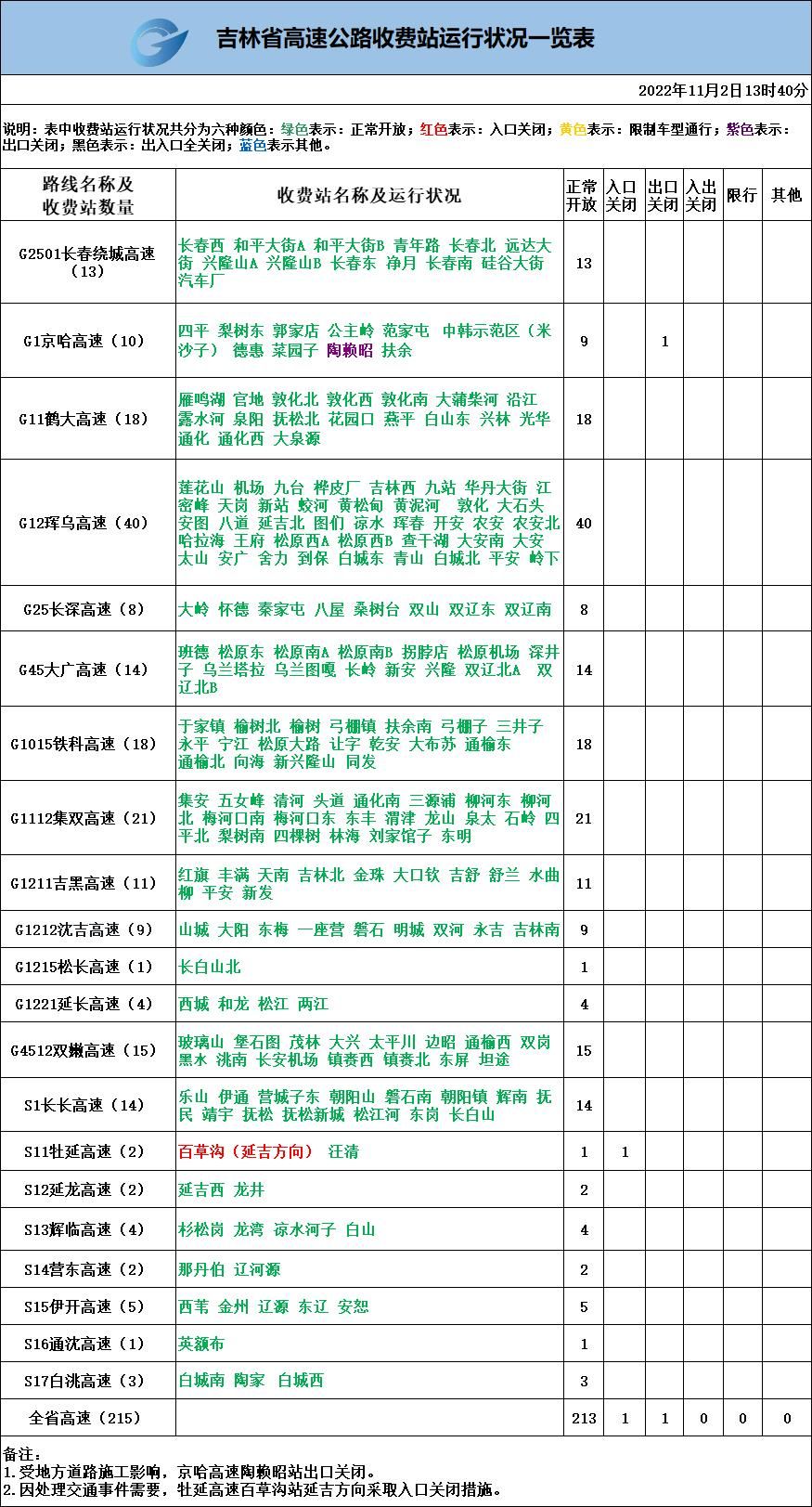 吉林省高速公路收費(fèi)站運(yùn)行狀態(tài)一覽表2022年11月2日